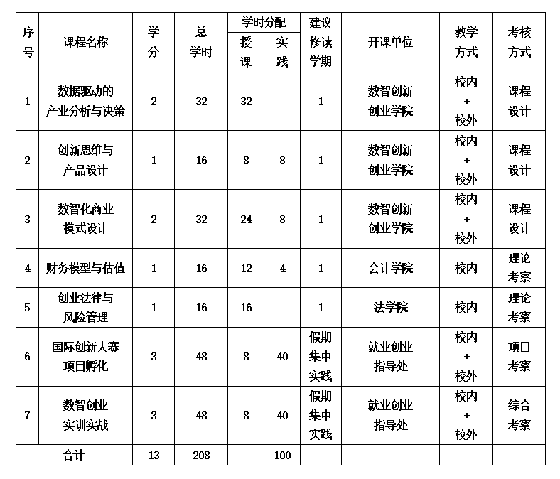 7.《数智创业实训实战》(3学分48学时):同样由就业创业指导处开课,假期集中实践,通过综合考核让学生完整体验创业实战,提升项目落地能力。