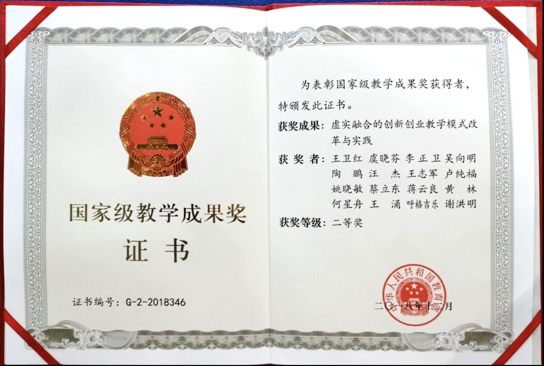 2018年,在教育部组织的高等教育国家级教学成果奖评选中,杭州贝腾科技有限公司携手浙江工业大学、湖州师范学院联合申报的教改项目《虚实融合的创新创业教学模式改革与实践》,凭借鲜明的创新特色、扎实的实践基础和显著的育人成效,成功荣获高等教育国家级教学成果奖二等奖。此次获奖的《虚实融合的创新创业教学模式改革与实践》项目,以“创新引领创业,创业推动创新”为核心理念,精准聚焦高校创新创业教育中理论与实践脱节、学生实践能力培养不足等痛点问题,构建了全方位、递进式的创新创业教育体系。