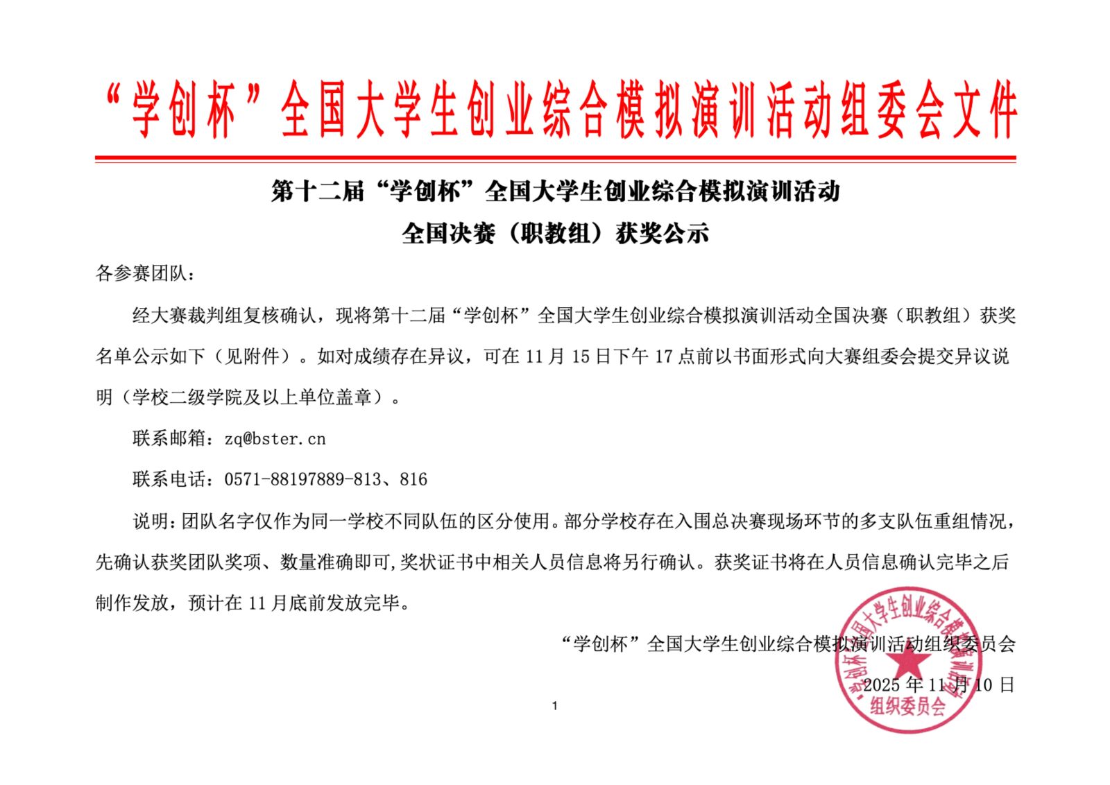 第十二届“学创杯”全国大学生创业综合模拟演训活动全国决赛(职教组)获奖公示