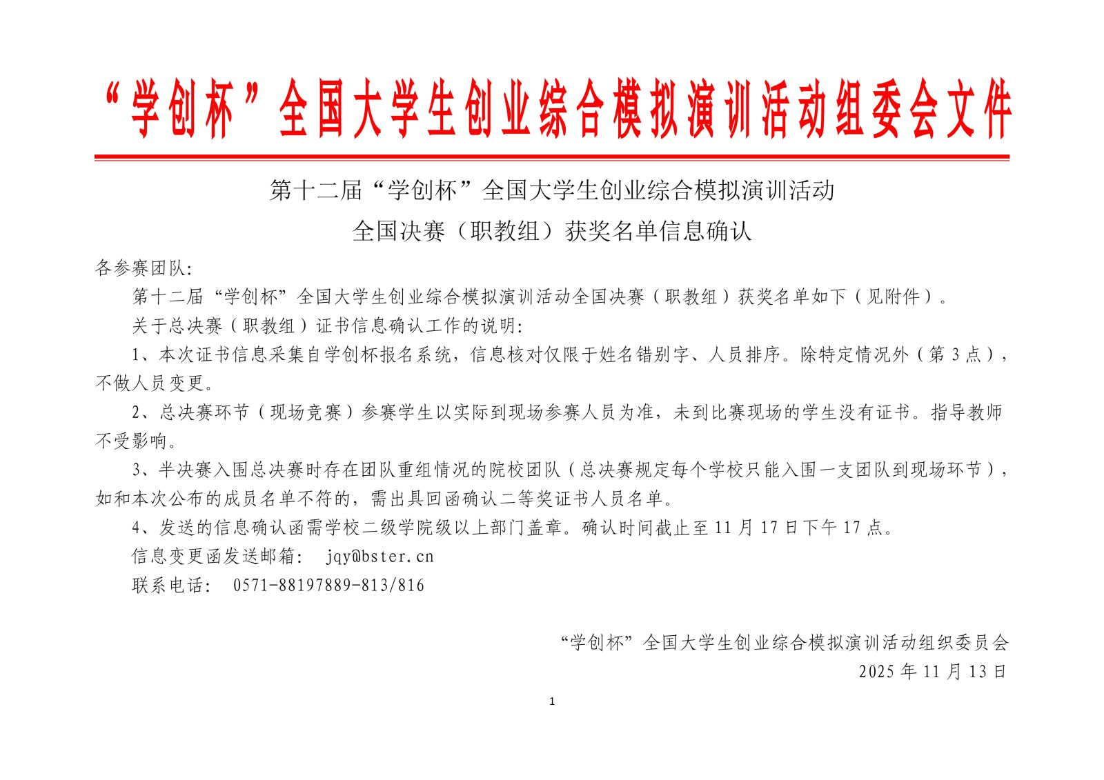 下载附件1:第十二届“学创杯”全国大学生创业综合模拟演训活动全国决赛(职教组)获奖名单信息确认
