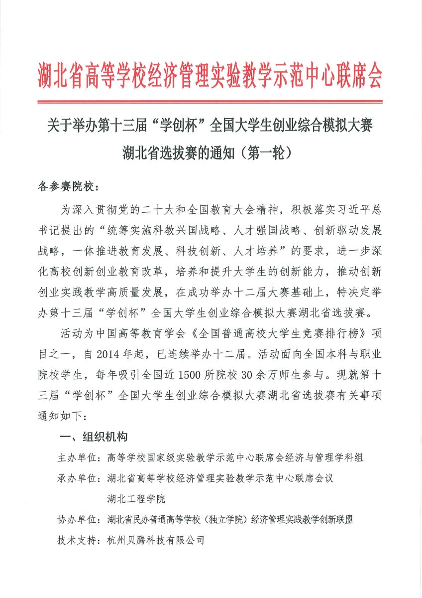 关于举办第十三届“学创杯”全国大学生创业综合模拟大赛湖北省选拔赛的通知(第一轮)