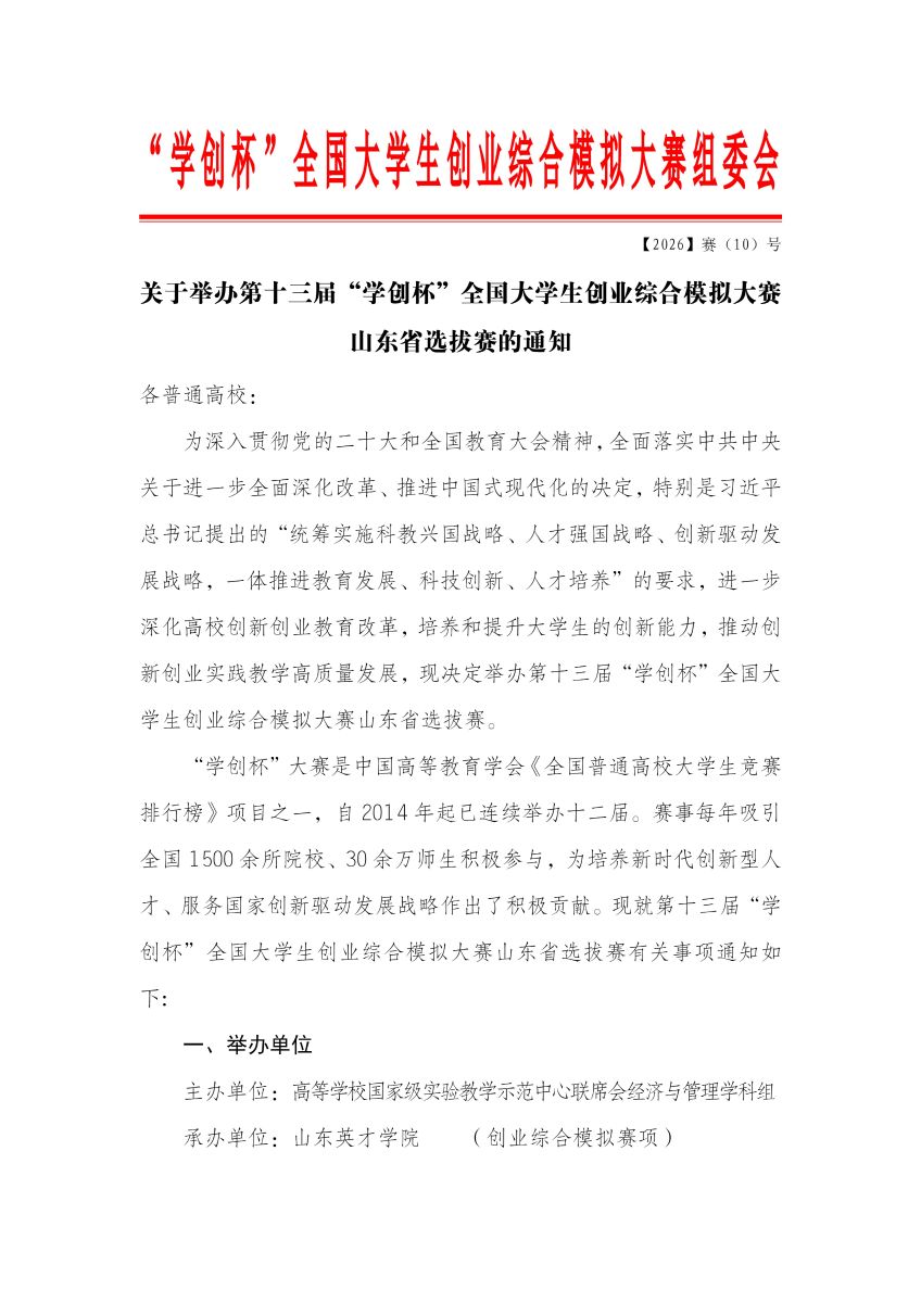 关于举办第十三届“学创杯”全国大学生创业综合模拟大赛山东省选拔赛的通知