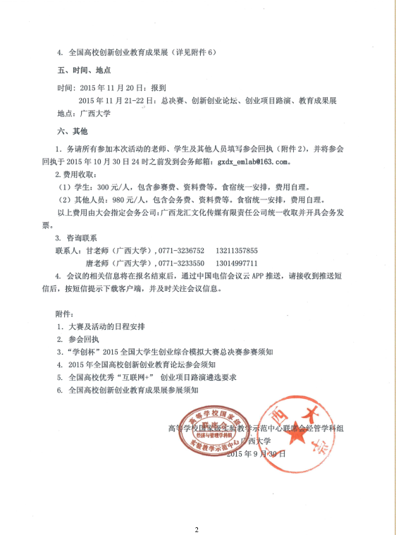 附件1:大赛及活动的日程安排 附件2-1:参会教师回执 附件2-2:参赛学生回执 附件3:学创杯2015全国大学生创业综合模拟大赛总决赛参赛须知 附件4:2015年全国高校创新创业教育论坛参会须知 附件5:全国高校优秀互联网+创业项目路演遴选要求 附件6:全国高校