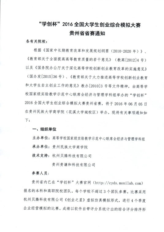 【通知】贵州省“学创杯”2016全国大学生创业综合模拟大赛省赛通