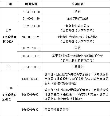 为全面贯彻落实《国务院办公厅关于深化高等学校创新创业教育改革的实施意见》(国办发〔2015〕36号)和教育部《关于普通本科学校创业教育教学基本要求》(教高厅〔2012〕4号)文件精神,探讨创新型创业教育的课程体系和实践教学形式,探寻创业教育的开展方式、方法,推动院校创新创业教育的深入发展,加强各院校间创业课程教学经验的交流,杭州贝腾科技有限公司和西安外国语大学商学院将于2018年4月20日在西安外国语大学长安校区举办全国高校创新创业教育实践教学研讨交流会。