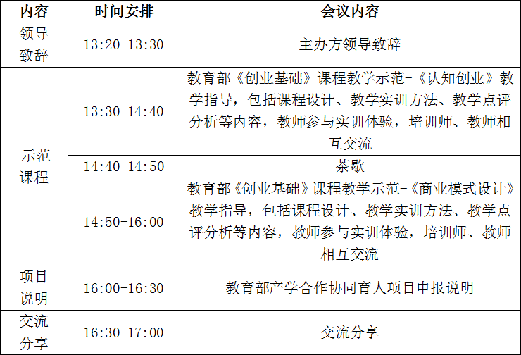 一、互动体验式的教学方法教学展示,教育部《创业基础》典型课程示范教学。现场体验创新创业教育实践教学的效果、学习先进的创新创业教学方式,切实提高创新创业教育的实践教学能力。会议具体内容详见附件。