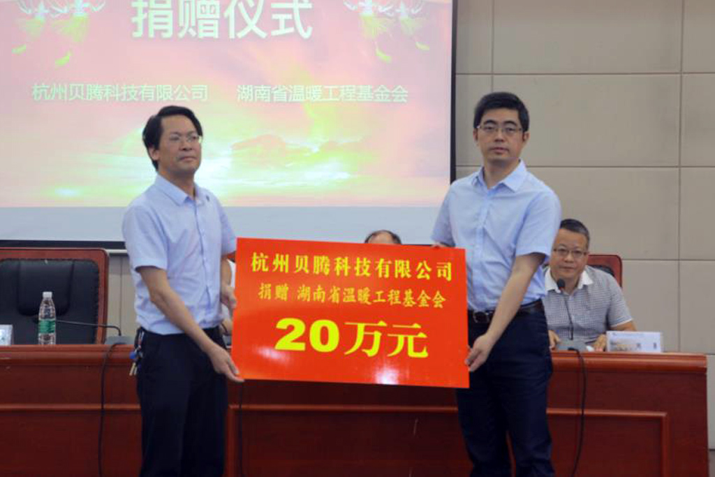会议期间,还举行了捐赠仪式。为支持湖南温暖工程公益事业,杭州贝腾科技有限公司向湖南省温暖工程基金会捐款20万元,这也是贝腾科技一直以来致力于教育事业的社会责任的体现。湖南中华职业教育社副秘书长冯立兵代表基金会接受了捐赠。