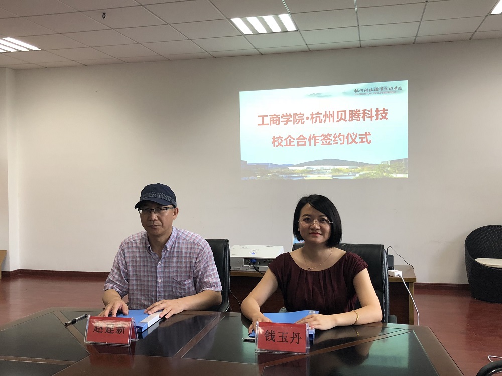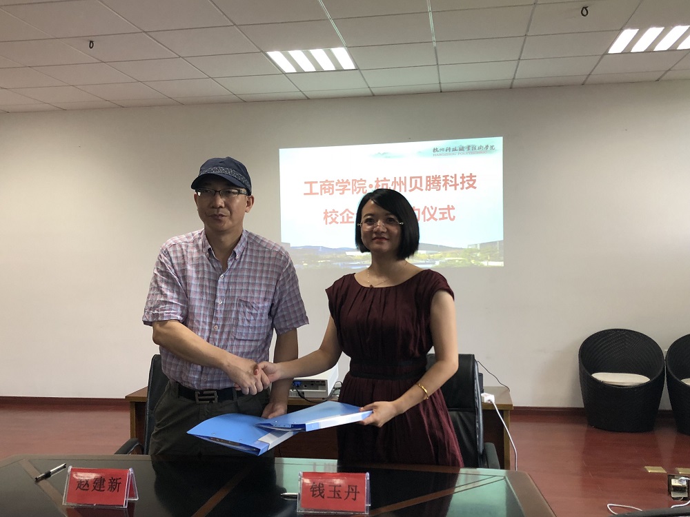 最后,工商学院专业带头人赵建新与贝腾科技东南区销售总监钱玉丹代表双方共同签署了校企合作协议。标志着杭州贝腾科技有限公司与杭州科技职业技术学院携手合作的大幕正式开启。