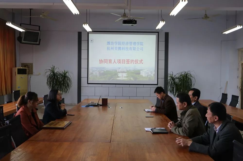 2018年10月24日上午10:00,潍坊学院协同育人项目授牌仪式在经济管理学院会议室顺利举行!授牌仪式由潍坊学院经济管理学院副院长刘建波教授主持,经济管理学院院长刘鹏、经济管理学院综合办公室主任焦云秋、经济管理学院管理学教研室主任邱祝军、经济管理学院人力资源教研室主任陈汇才、杭州贝腾科技有限公司华北区域销售总监马姗姗、杭州贝腾科技有限公司山东区域经理张伟晓共同出席了仪式。