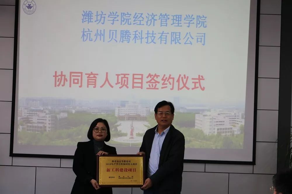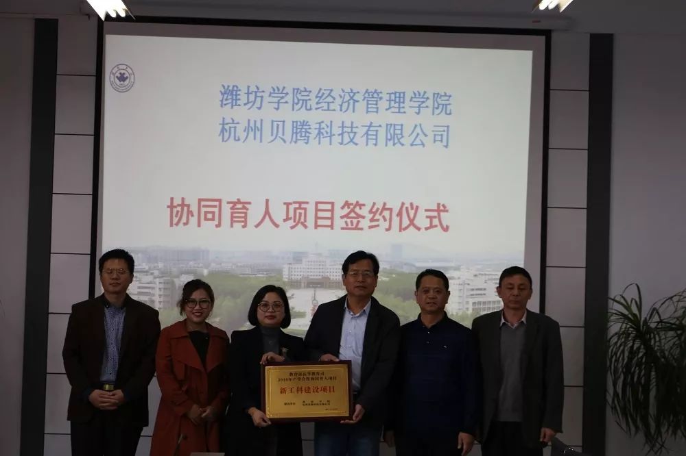 潍坊学院经济管理学院院长刘鹏教授、杭州贝腾科技有限公司华北区域销售总监马姗姗分别发表了讲话。最后,双方进行了授牌仪式,贝腾科技与潍坊学院合作的“教育部产学合作协同育人新工科建设项目”正式挂牌!