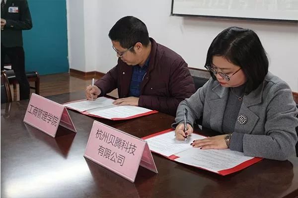 11月21日下午,杭州贝腾科技有限公司和郑州成功财经学院工商管理学院在学院会议室举行了2018年第一批教育部高教司产学合作协同育人项目签约及授牌仪式。郑州成功财经学院工商管理学院院长杨松柏、党总支书记闫蕾蕾、教学秘书张瑜、团总支书记朱宏东、杭州贝腾科技有限公司华北区域销售总监马姗姗、河南区域经理李亦函以及工商管理学院各教研室主任共同出席了此次仪式。