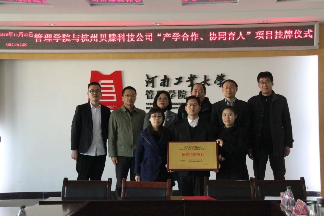 11月22日上午,杭州贝腾科技有限公司和河南工业大学管理学院在学院会议室举行了2018年第一批教育部高教司产学合作协同育人项目签约及授牌仪式。河南工业大学管理学院党委书记赵云平、副院长徐恒、李广平,教学办主任苗贵涛、工商管理系党支部书记陈晓霞、系主任贾留战,杭州贝腾科技有限公司华北区域销售总监马姗姗、河南区域经理李亦函以及学院教师共同出席了此次仪式。