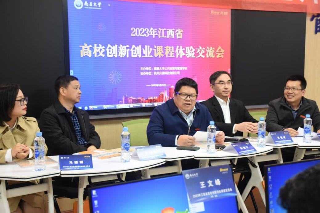 为响应“大众创业、万众创新”方针,深入贯彻落实国务院国家教育事业发展“十三五”规划文件精神,激励大学生培养创新创业意识,提高创新创业能力,2023年3月25日下午,江西省高校创新创业课程体验交流会在南昌大学法学楼隆重举行。本次活动由南昌大学与杭州贝腾科技有限公司共同主办,由南昌大学公共政策与管理学院承办。出席本次会议的主要嘉宾有南昌大学教务处副处长兼创新创业学院院长徐健宁,南昌大学公共政策与管理学院院长尹利民、副院长袁小平、管理科学与工程系主任薄秋实,杭州贝腾科技有限公司华北大区总经理马姗姗女士、市场总监肖竟成先生以及来自省内30所高校的近70位创新创业教育负责人、双创课程建设负责人、双创赛事负责人、经管专业负责人及骨干教师等。