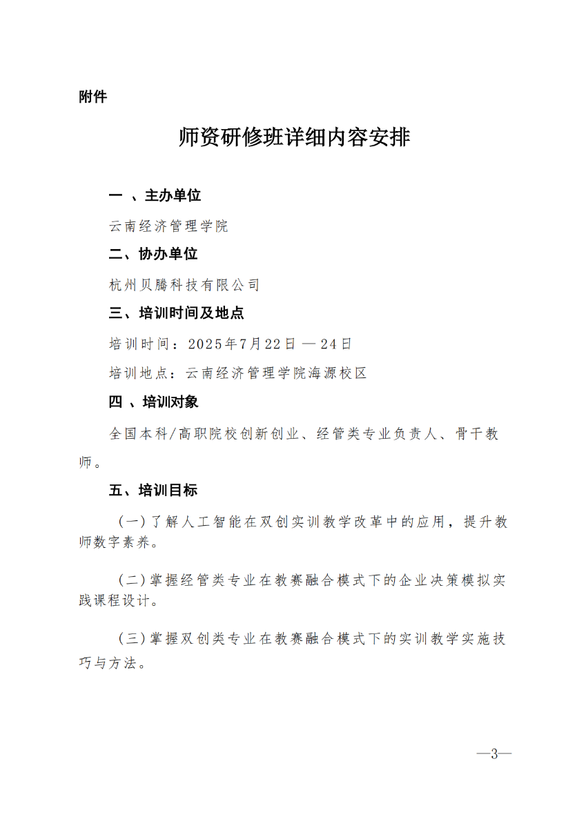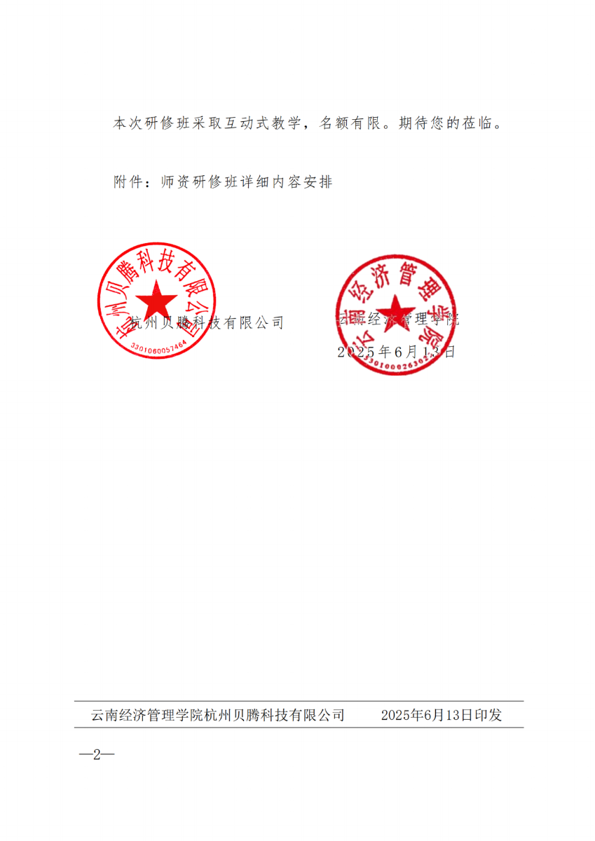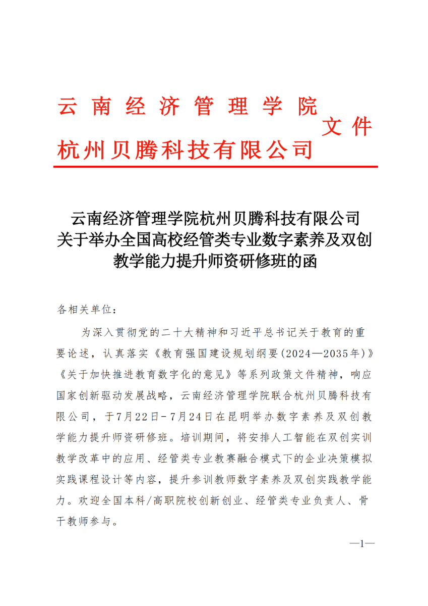 云南经济管理学院杭州贝腾科技有限公司关于举办全国高校经管类专业数字素养及双创 教学能力提升师资研修班的函