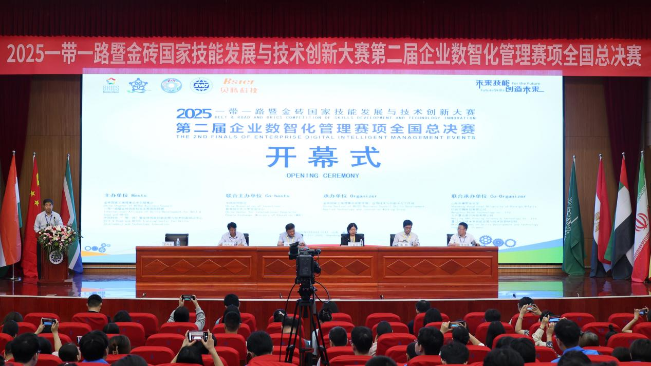 最后,金砖国家技能发展与技术创新大赛组委会执委会竞赛办公室二处处长何美连上台致辞。她强调了金砖国家框架下技能发展与技术创新合作的重要性和企业数智化管理赛项对于推动产业数字化转型的积极影响。同时,郑重宣布2025一带一路暨金砖国家技能发展与技术创新大赛第二届企业数智化管理赛项全国总决赛正式开赛。