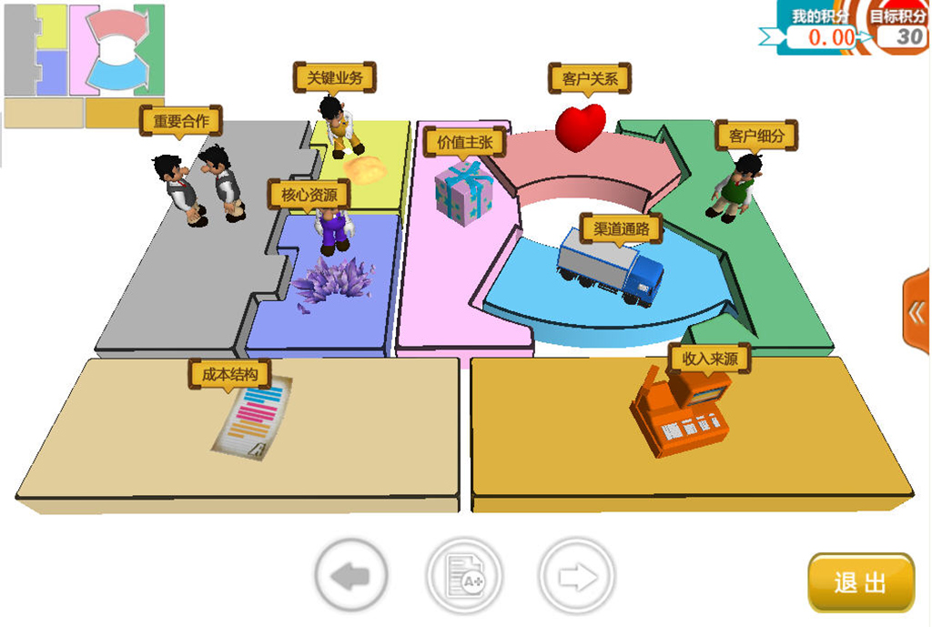 2、自主学习环节包含商业模式设计初识、商业模式设计进阶、商业模式项目路演。系统提供一套完整的商业画布分析设计工具,包含客户细分、价值主张、渠道通路、客户关系、收入来源、核心资源、关键业务、重要合作和成本结构9个要素。并提供不少于5个案例的商业模式供学员学习演练。学员可以通过此环节学习商业模式9大要素,并进行初步的模拟训练。