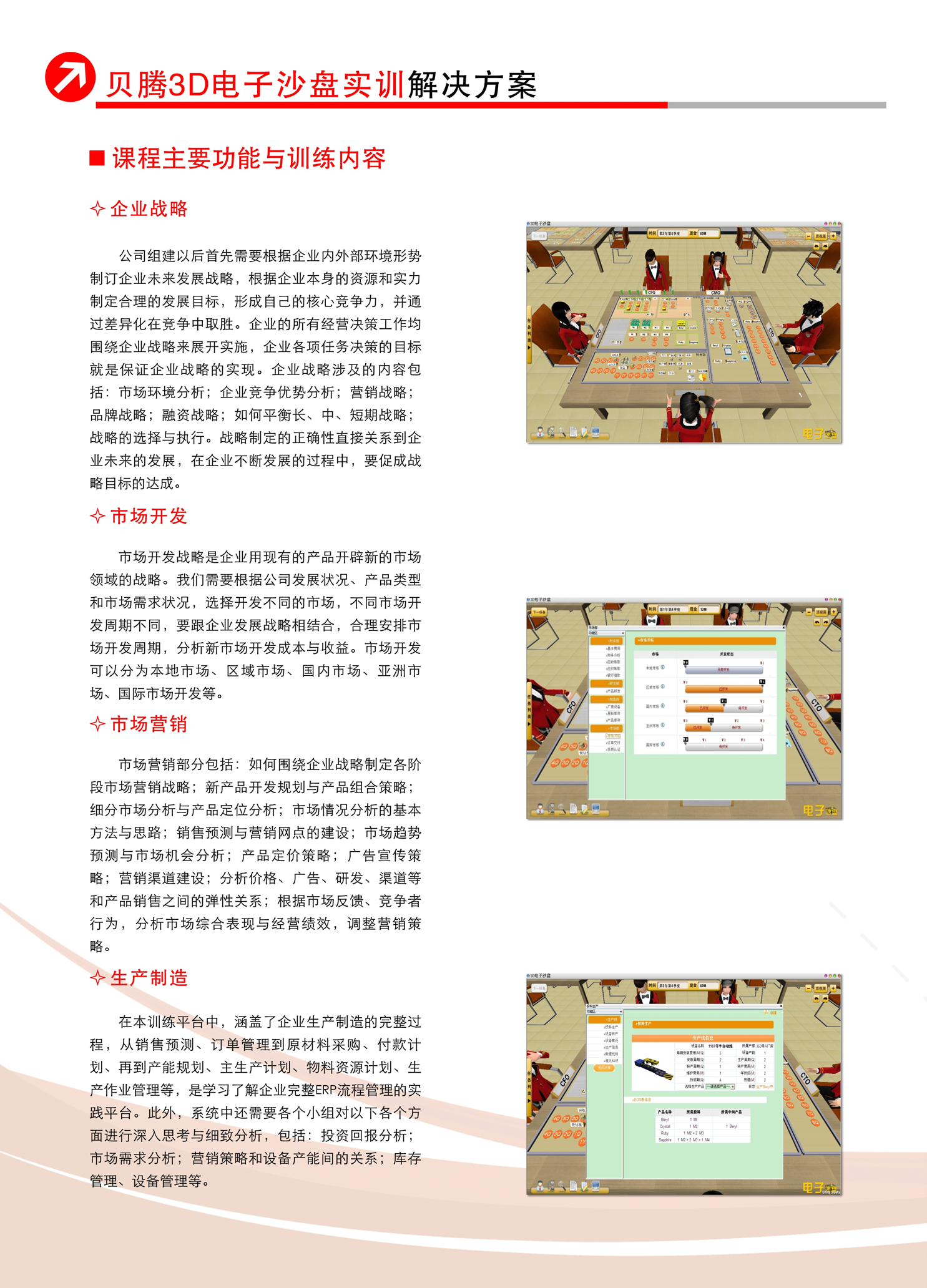2、功能模块:包括企业战略、研发认证、市场开发、生产经营管理、市场营销、财务管理等功能模块,能够完整模拟企业经营中的各项决策任务;