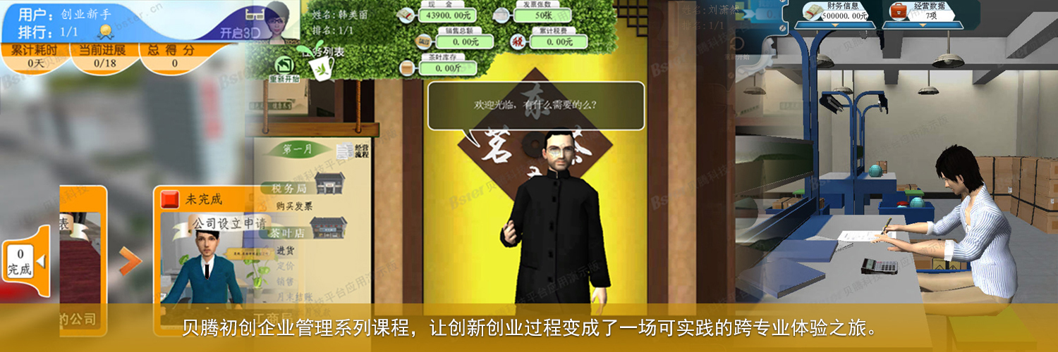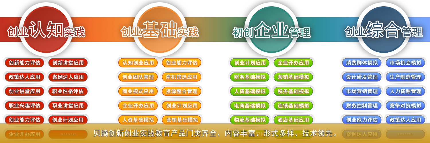 创业基础实践课程包含了认知创业应用、创业能力评估、创业团队管理、商机筛选应用、商业模式应用、资源整合管理、企业开办应用、创业计划应用、人资基础模拟、营销基础模拟和财务基础模拟等课程